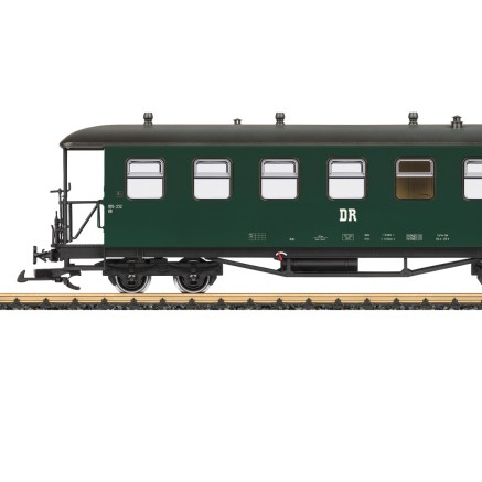 Passend zur Epoche der Dampflokomotive VII K rollt ein Gepäckwagen der DR aufs LGB-Gleis. Wagennummer ist die 974-102.